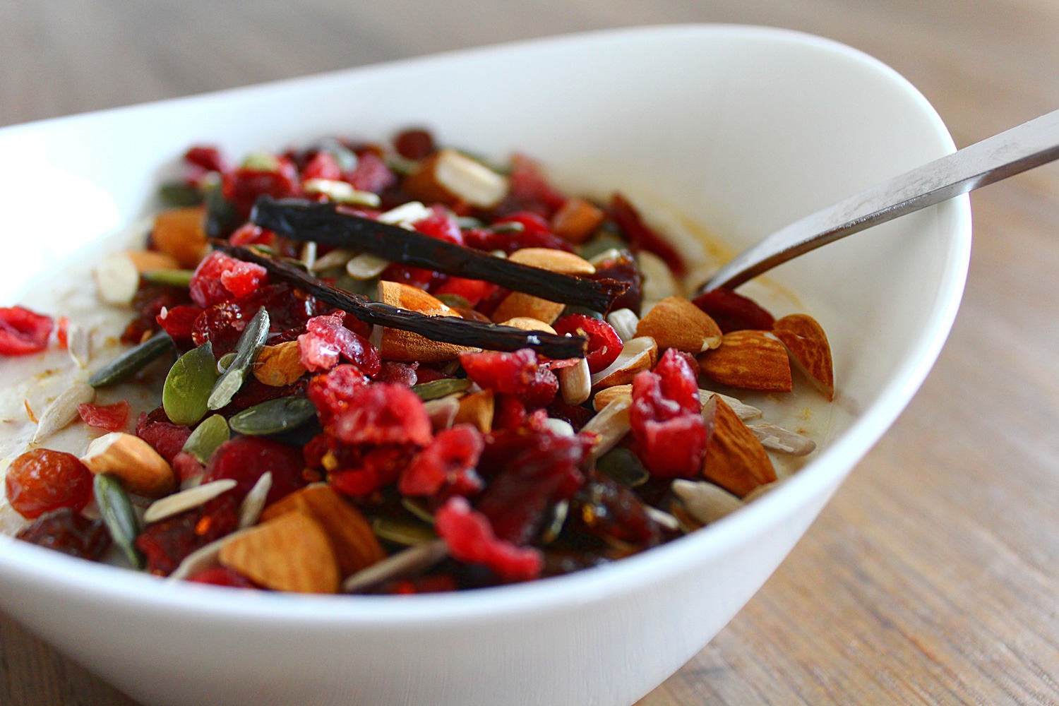 Décorez de noisettes toastées, de graines de courge, d’éclats de cacao cru et de quelques tranches d’orange.