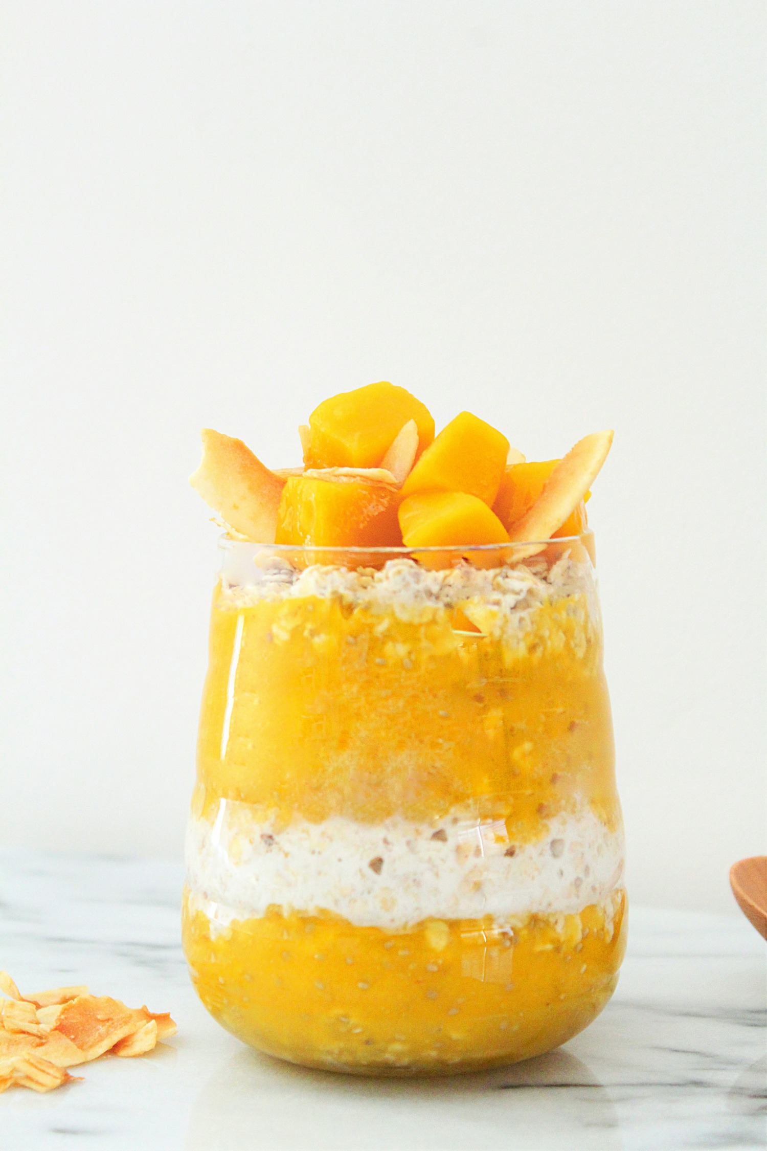 Avant de servir ajouter un peu de brunoise de mangue dans le fond de la verrine, compléter avec le riz au lait puis ajouter une seconde couche de brunoise de mangue.