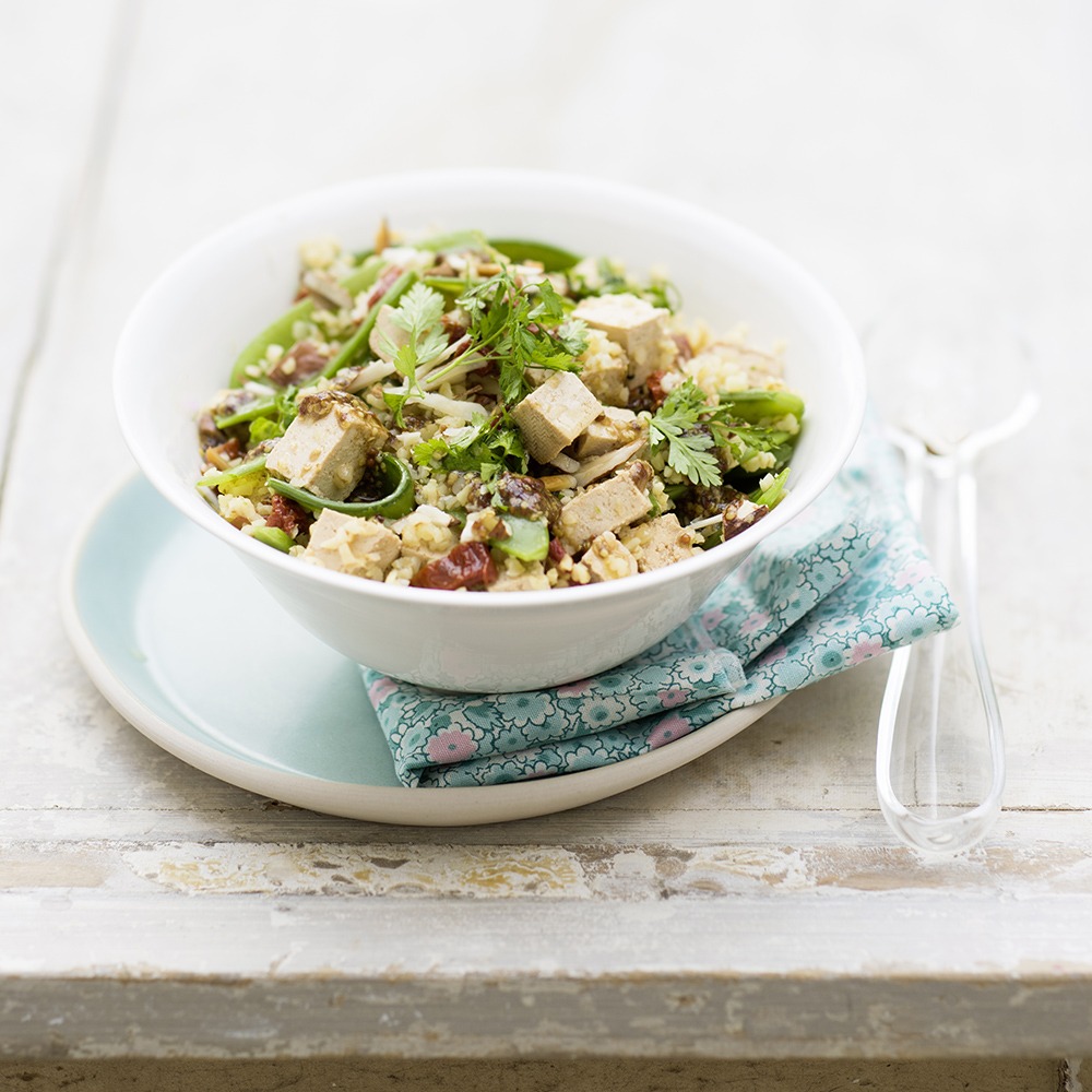 Pelez et râpez les carottes, mélangez-les au tofu en ajoutant l »huile d’olive et quelques pincées de grains de cumin.
