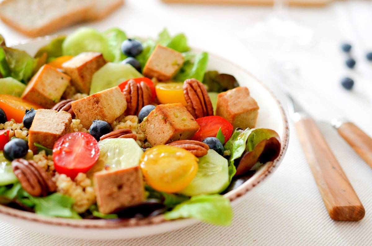 Émiettez le tofu Bjorg et faites-le mariner avec la sauce soja, le jus de citron et l’échalote hachée finement pendant 10 min a température ambiante.