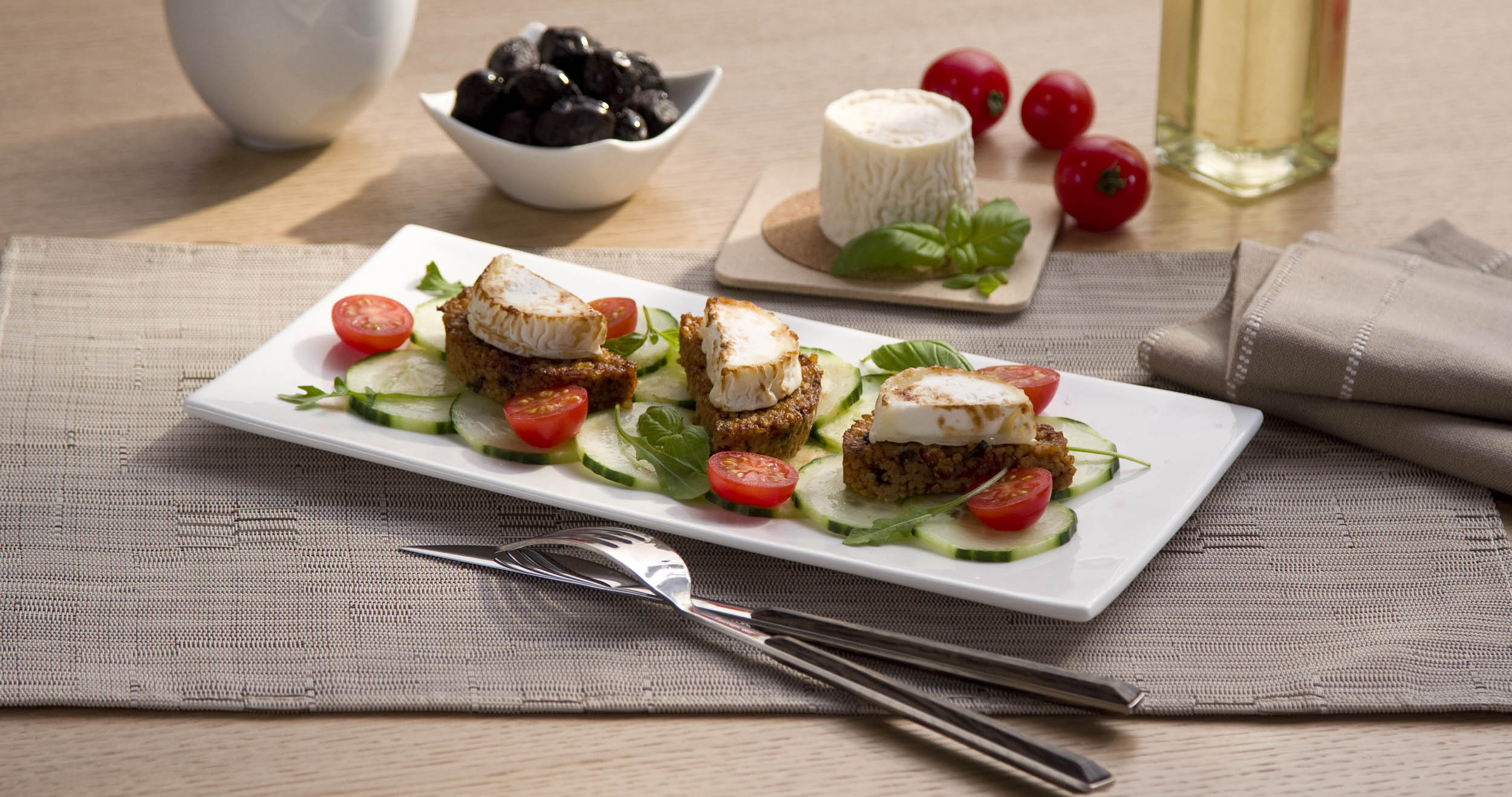 7. Enfournez les palets pendant environ 5 mn afin que les fromages de chèvres soient fondant et dorés. Disposez-en 3 par assiette, parsemez de tomates cerises, d’olives et de feuilles de basilic.