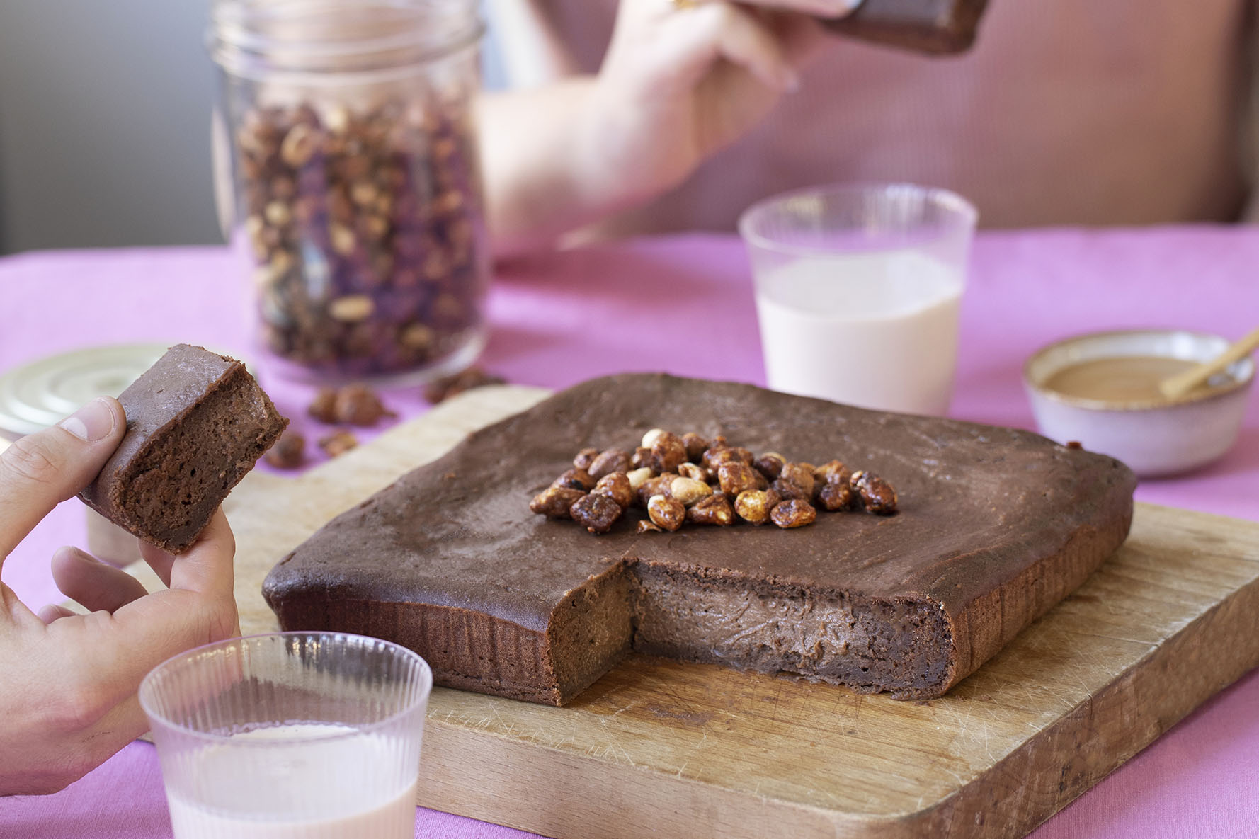 Mixer le beurre de cacahuète avec le tofu soyeux Bjorg, le sucre, le cacao, la pincée de sel, la vanille, le lait de noisettes et l’huile.